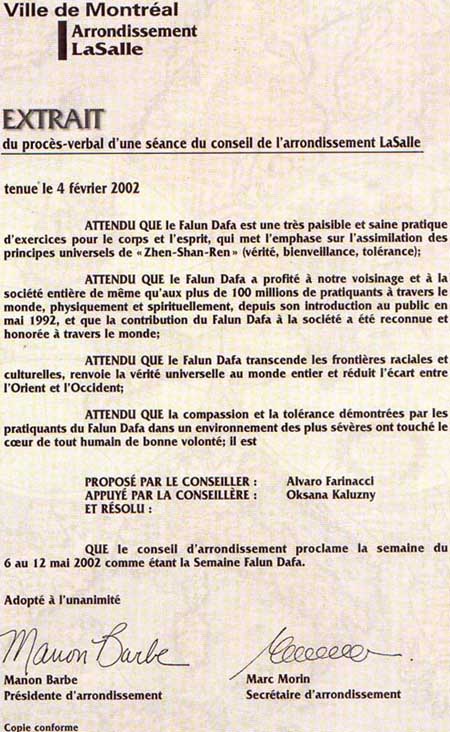 以下为蒙特利尔市拉萨丽行政区褒奖的译文: