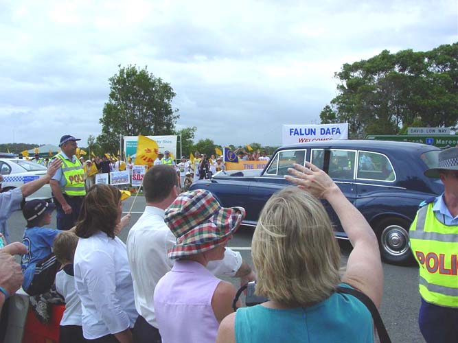 英女王在坐驾里见到了大法弟子的场面