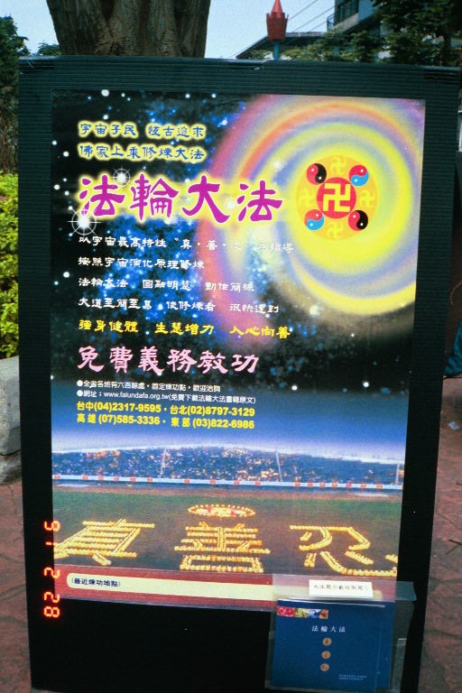 每天清晨,台湾各处的公园都有大法的炼功音乐在空中悠扬,大法展板的故事持续的上演着。希望这样美好的景象不久的将来也会在中国大陆各处呈现!