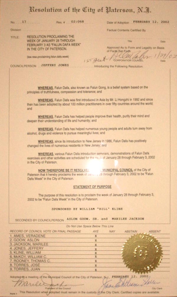 为此,帕特森市议会宣布2002年1月28日至2月3日为帕特森市“法轮大法周”