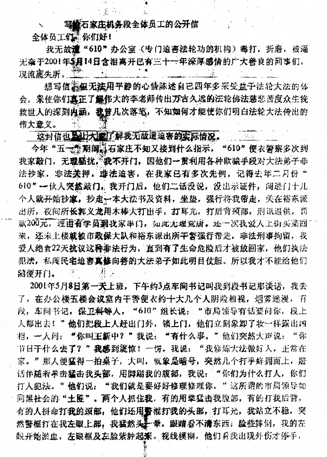 如您所知,法轮功是一个融合了打坐、柔和的动作锻炼和道德教导的身心修习。法轮功于1992年从中国东北传出,发展迅速。1999年中国政府的一项调查估计有七千万到一亿中国人在修炼法轮功。而今天,修炼法轮功的人遍布世界四十多个国家。