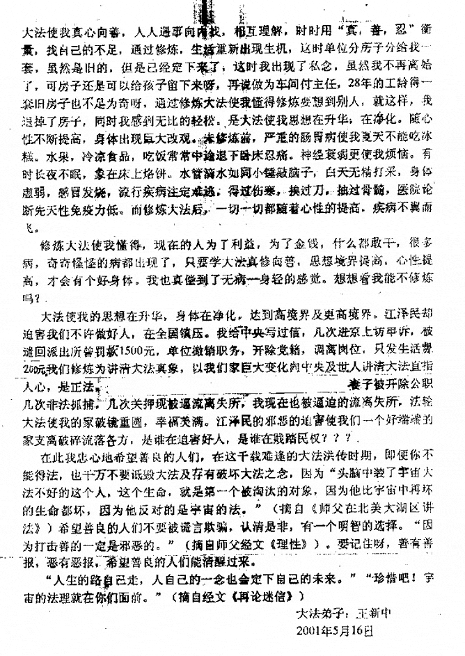【明慧网2002年4月13日】我曾经极力反对妻子修炼法轮功。我从原来反对大法到现在理解和支持妻子修炼,并利用一些可能的机会向身边的人传递和讲述大法受迫害,特别是“自焚”的真相,是经过了一个真实而又曲折的思想转变过程。今天由衷地把自己的这段心路历程写出来,希望对有缘读到我的这段经历的人,特别是那些目前仍抵触大法,不了解法轮功真相的人有所帮助和启发。事实证明:迫害“法轮大法”“真善忍”,小到会给家庭带来不幸,大则会给整个社会、民族和国家带来灾难。