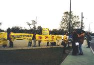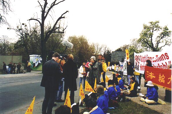 当江泽民和萨克森州州长在凯宾斯基酒店共进午餐时,近百名法轮功学员在离酒店不远处的市中心文化宫前召开了记者招待会。一个月前刚从北京的团河劳教所被释放的爱尔兰三圣学院研究生赵明也出席了记者招待会,讲述他在北京因上访而被劳教两年,遭受酷刑迫害的经历。