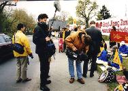 星期六在市中心波歇尔大街(PorschestraBe)的C&A商场旁就已经举行了一个法轮功信息日。从早上十点到下午四点来自整个德国──特别是来自德国南部地区的法轮功弟子在那里公开展示法轮大法。这次活动的一位组织者Vitali Uhl说:“我们主要希望人们关注中国的政治形势和在中国发生的残酷迫害。”星期六在各斯拉(Goslar)和柏林(Berlin)也同时举行了活动。这两个城市也在江泽民的行程之内。