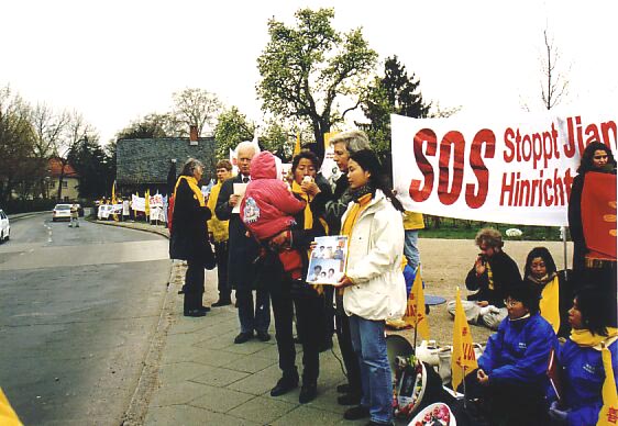 人权活动家和在中国被(江泽民)禁止的法轮功成员举行的一系列抗议,成了江出访德国的特征。
