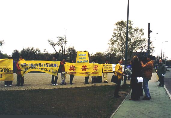 报导还说,星期二,当江与总理施若德(Chancellor Gerhard Schroeder)会面时,法轮功学员在柏林中心的爱德隆旅馆(Adlon Hotel) 外面举行了大规模的打坐炼功活动。