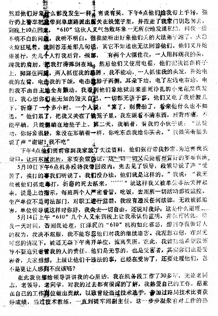 两年来我在黑嘴子劳教所遭受到残酷的迫害,被灌食、关小号、电棍电、每天干活20个小时,劳教所极邪恶,将学员绑在死人床上用电棍电,一学员被恶警电阴部,疼得满地打滚。然而酷刑无法动摇我对师父、对大法的坚信。