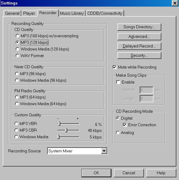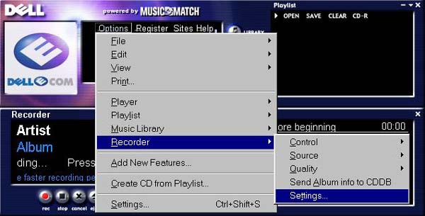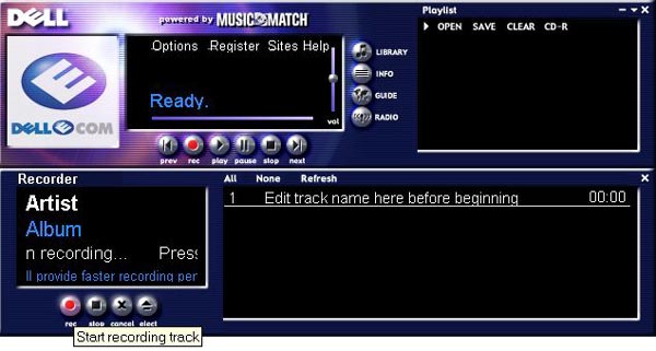 5.将要转录的音乐文件准备好,如用Real Player播放RM/RA/RAM文件,用Windows Media Player 播放MPG录像等。点击MUSICMATCH Jukebox录音面板(Recorder)上的红色“Rec”(录音)键即开始录音。紧接着用Real Player等开始播放所要转录的文件。播放完毕后,按录音面板(Recorder)上的“Stop”(停止)键,录音完成。