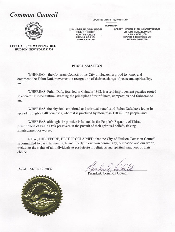 鉴于,哈德森市议会荣幸地嘉奖和赞扬法轮功和平与高尚的学说;以及