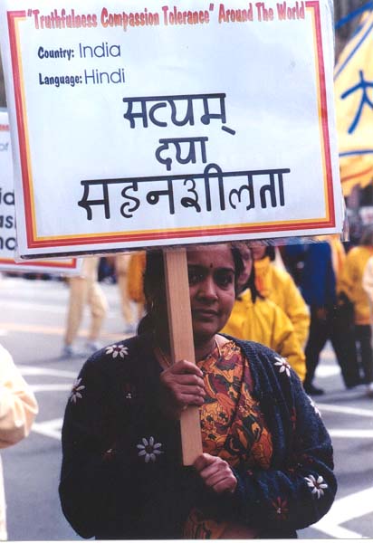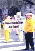 樱花节游行终于到了,我们的中国弟子穿着旗袍手举着中文‘真善忍’牌子,韩国及印度的弟子也穿着本国服装拿着自己的文字。灿烂的阳光下,二十多种文字的“真、善、忍”行进在美国首都华盛顿的宪法大道上,一路赢得了很多的赞赏。游行结束后,中国文化节又在国会山庄和华盛顿纪念碑之间的大草坪上展开了,我们将所有的展板排列在草坪上,很多观赏节目的游人也顺道参观了我们的“真善忍遍布全世界”的展板。大家聚精会神的读着不同文字的“真、善、忍”,感叹道:这个世界确实需要“真、善、忍”!