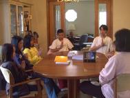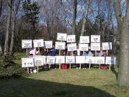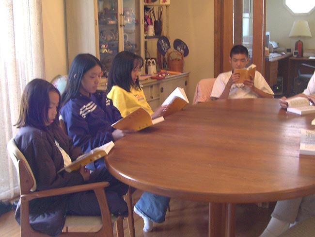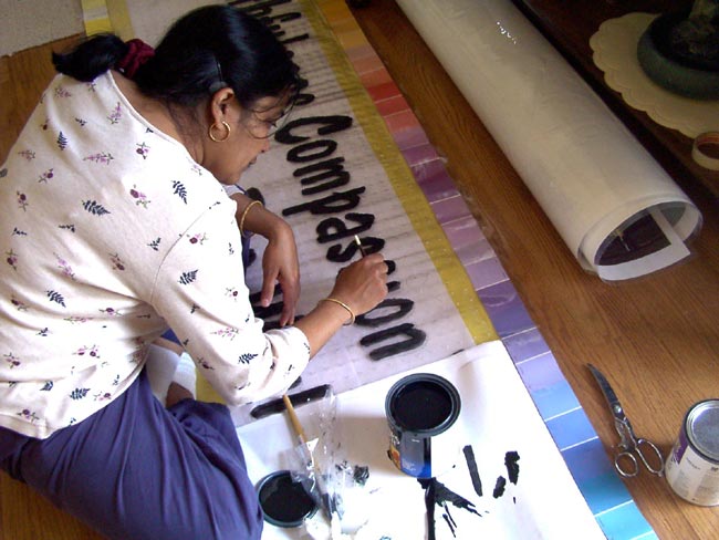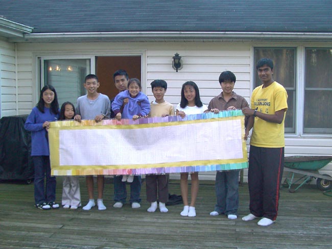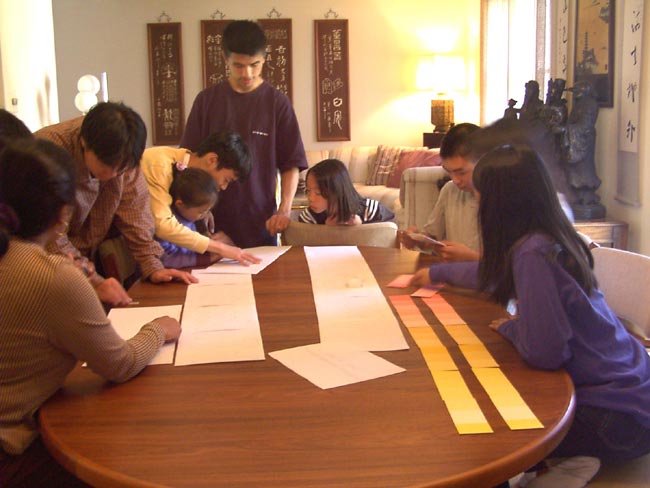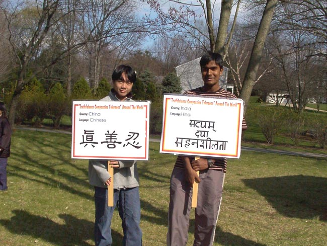 正值春假期间,明慧学校的师生用了两天的时间,做了一个“真善忍遍布全世界”的横幅,并将打印压膜后的各国“真、善、忍”贴在展板上,准备樱花节游行时使用。每天工作之前,大家都先认真学法和发正念。孩子们合作无间,气氛祥和。有一孩子问:“我们为什么不上网去找这些字而要找各国大使馆呢?”明慧学校的老师回答:“平时我们对他们讲真相,告诉他们法轮功在中国被江xx迫害,他们都了解和同情,但他们想直接声援比较困难。这次,我们让他们再次听到大法,并且我们需要的只是他们国家语言的‘真、善、忍’三个字,他们是很容易办得到的。而所有回信的国家不是又在大法中摆放了一个位置吗?…”孩子们听明白了,回头更认真的做着手上的事。