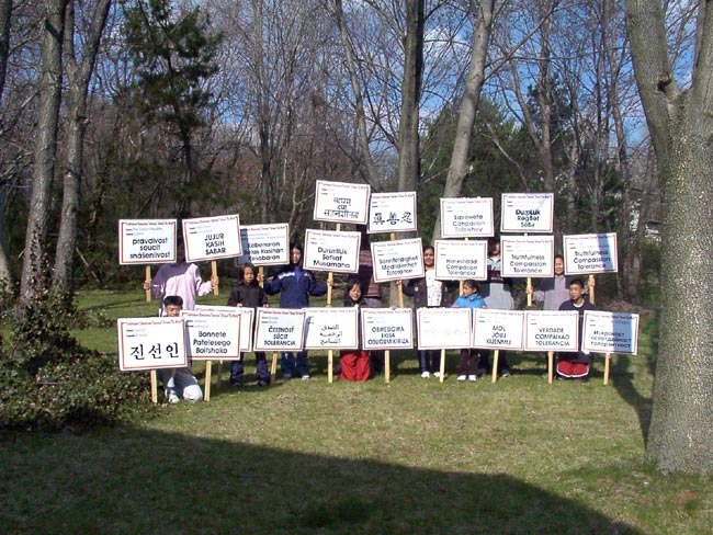 根据现有的条件,明慧学校的老师(大法弟子)拟定了一个题目, 叫作“真善忍遍布全世界”(Truthfulness Compassion Tolerance Around the World)。首先学生们写信给多个国家大使馆的大使,介绍明慧学校,告诉他们我们学校的教学是以法轮大法为根本,把“真、善、忍”带给人们,不分年龄,不分种族。我们特别把师父教我们的“真、善、忍”每个字的意思写下,希望他们能更了解其中的内涵。同时我们提出:希望他们能提供他们自己语言中,“真、善、忍”三个字如何拼写并请注上发音,以便我们把各国文字的“真、善、忍”三个字放在展板上用于樱花节游行和展览。