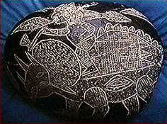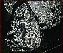 其中一颗石头上刻着一幅图,一个惊慌的人被一只暴龙追着跑,他很害怕地向前跑。这个暴龙跟我们在电影“侏罗纪公园”(Jurassic Park)中看到的暴龙是一样的,是一种站立的恐龙,后腿非常强壮有力,而前面的手很短,好像发育不良,看起来跟它的庞大身躯体积很不相称。现在恐龙专家挖掘出恐龙化石后,经过仔细的分类整理,然后以复原的方式拼凑出原来的骨架,再根据合理的推测而描绘出恐龙当年的样子。雕刻这些石头的人,如果不是生活在一亿多年前,那么他们显然具备跟现在科学家同等的知识,可以藉由复原化石绘制出恐龙的形态。