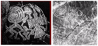 我们看看这两张图。一个是ICA石雕,一个是那斯卡平原上的巨画。在ICA出土的一块石头上,雕刻着与那斯卡平原上的巨画几乎一样的猴子图。雕刻石头的艺术家是否也是那斯卡巨画的作者?难道令人费解的那斯卡巨画也是巨人所画?