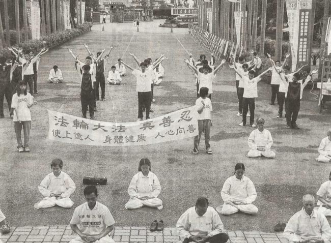 校庆活动昨天上午八时先由校长邱茂城带领来宾与老师在校园内植树,代表校务像绿树长满枝叶欣欣向荣,学生社团也分别展现所学技能,有跆拳道、柔道等,一个月前成立的法轮功社学生也表演法轮功。中国大陆官方禁止法轮功学员公开表演,这里法轮功学员不但可以自由聚集研讨,还可传入校园,让学生学习。法轮功学员吴庆钟说,法轮功教导学员学会真、善、忍,高中学生血气方刚,学习可以修身养性。
