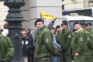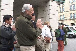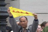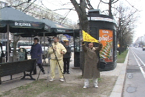 【明慧网2002年4月22日】柏林,2002年4月10日中午,江泽民离开旅馆去波斯坦,大法弟子守在旅馆外发正念,当车队路过时,大法弟子打出横幅,高喊“法轮大法好”。