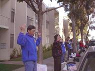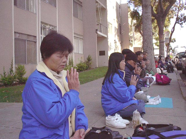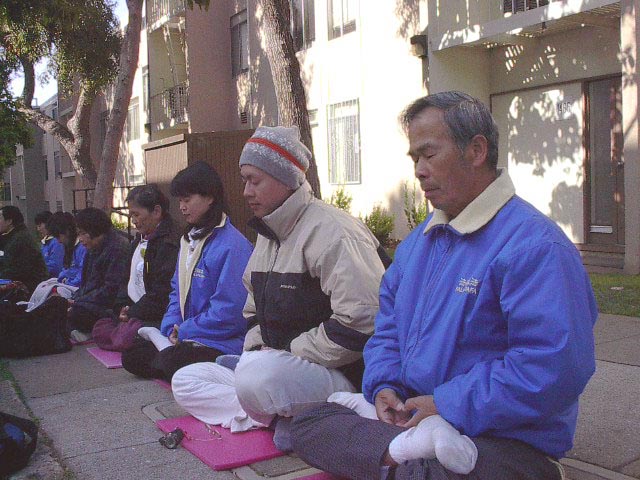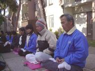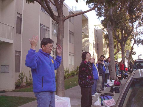 图为星期天早晨大法弟子在晨光中炼功和继续发正念,铲除邪恶。
