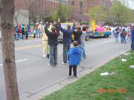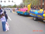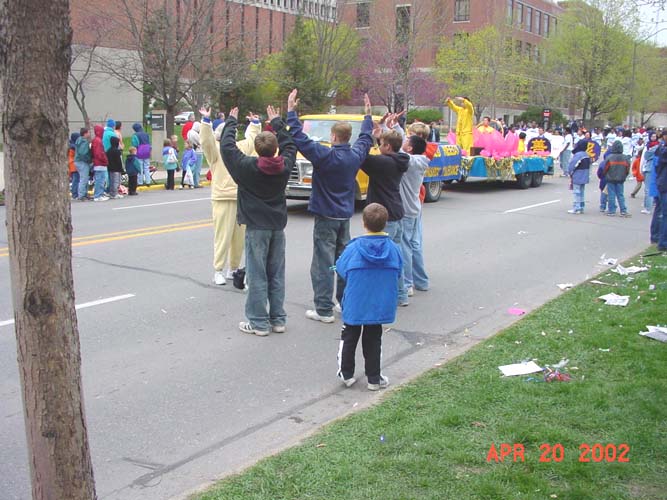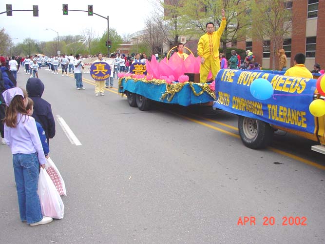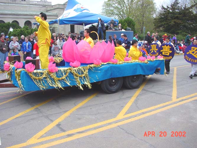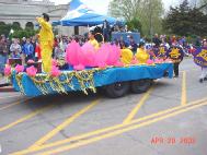 游行从开始到结束历时2个半小时。整个上午天都是阴阴的,看不见太阳。当我们的队伍终于移动到游行的起点时,阴沉的天空骤然变亮,久违的阳光透过厚厚的云层洒了下来,带来了丝丝暖意。队伍的最前排是由4位学员展开的英文“法轮大法-真善忍”大型横幅,队伍中有学员手持印有“法轮大法--真善忍”的彩色气球沿途分发。我们彩车上的大莲花十分引人注目,舒展的粉红色的巨大花瓣在风中轻轻摆动,一张一合,恰如春日中正在盛开的花朵。彩车上有学员不断演示着功法。许多观众都被这优美的画面,舒展的功法所吸引,沿途有许多人向我们鼓掌,挥手,更有不少人手持相机摄下了这美丽的一刻。还有好奇的孩子们模仿着炼功动作,于是有学员干脆停下来现场教功。当队伍经过主席台时,现场转播的摄像机紧紧地追踪着我们,主持人介绍着法轮大法。贵宾席上的许多嘉宾都微笑着向我们挥手致意。希望这摄像机能将这“真善忍”的美好信息和画面带给更多善良的人们。活动中,学员们一直在持续地发出正念,清除邪恶在人间的一切干扰和表现。我们带的几千份资料在游行还没结束前就已发完了。