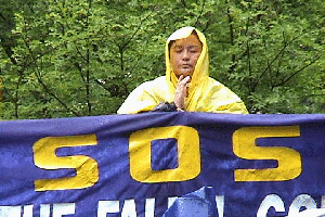 天阴沉沉的,终于,在午间,下起了雨,伴随着寒冷。大法弟子们,端坐不动,立掌除恶;