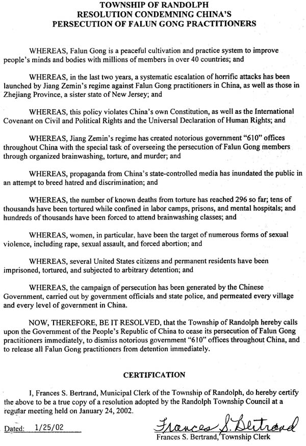 伦道夫市议会特此呼吁中华人民共和国政府(江泽民)立即停止对法轮功学员的迫害,撤销遍及全国的臭名昭著的“610”政府办公室,立即释放所有被关押的法轮功学员。