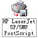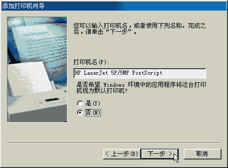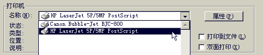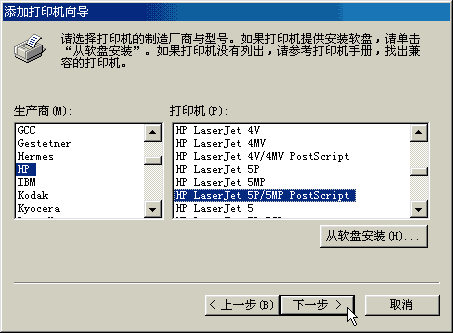 2、在“生产商”中选择“HP”,在“打印机”中选择“HP LaserJet 5P/5M PostScript”,如果没有随便找一个PostScript打印机也可以: