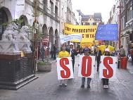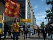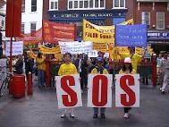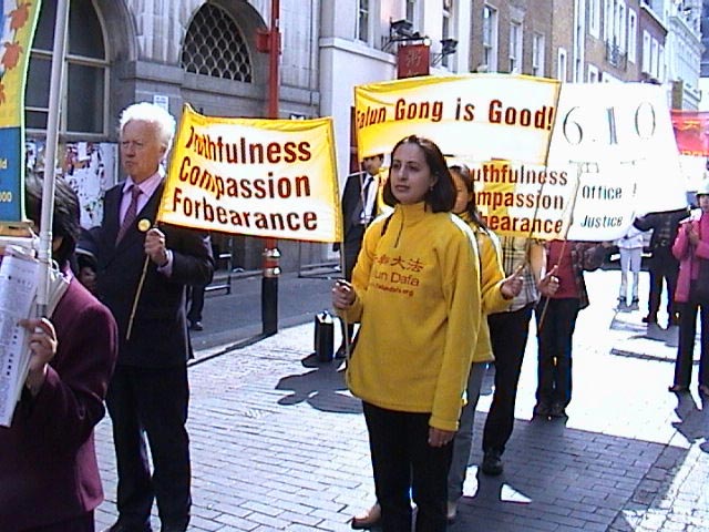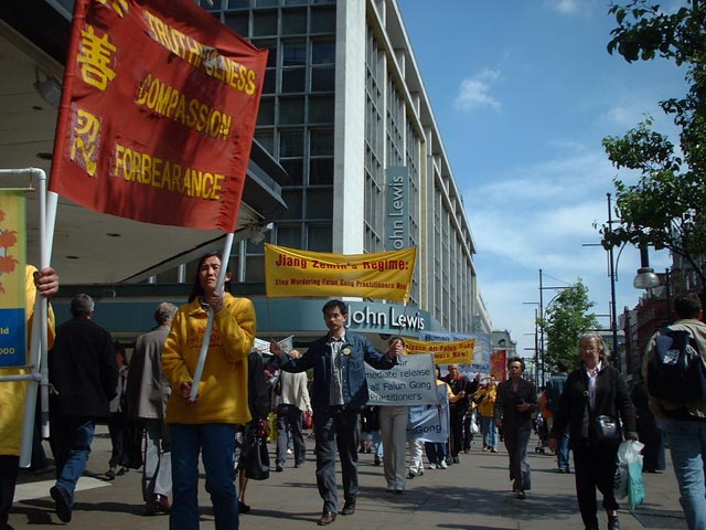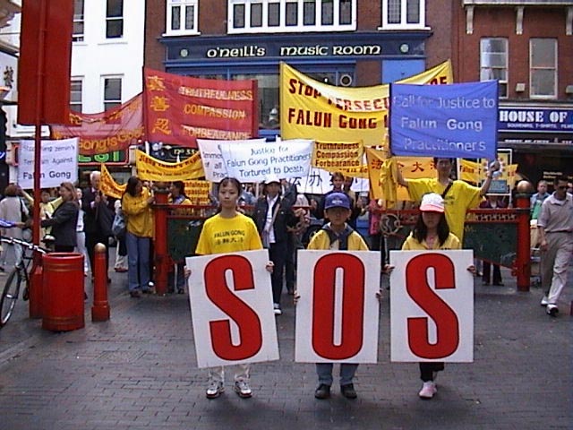 中午12时,在普度和济世的音乐伴奏下,由中使馆至首相府的游行队伍缓缓起步。三名大法弟子手持SOS标语板在前,随后的学员手举各种大法横幅依次在后。 庄严肃穆的游行队伍在繁忙的伦敦街头引人注目,路上行人纷纷驻足观看并不时索取大法资料。很多早已了解法轮功真相的人们不时用手势和言语向游行队伍表示敬佩和支持。路过唐人街时,很多餐馆和店铺的华人纷纷走出来观看。很多人愿意接受大法的真相材料。一位华人在向一位大法弟子了解了一些真相问题后,郑重地表示一定阅读真相手册。一些华人还打听炼功地点。在唐人街停留的短暂时间里,很多华人都手持真相手册。人们已逐渐认清江泽民集团一贯的欺世谎言,特别是对法轮功的造谣诬陷已不再具有效力了。
