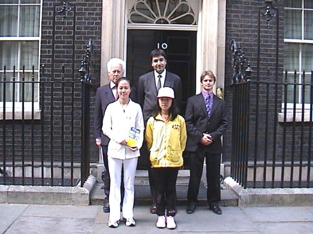 午后4时,游行队伍抵达唐宁街首相官邸对面。几名学员代表赴首相府递交请愿信,于此同时,其余学员默默地伫立在人行道上,齐发正念,助师正法。