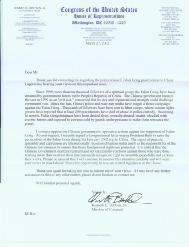 我强烈反对中国[江泽民]政府对法轮功支持者们的镇压。应您的要求,我最近在一封国会信件上签名,敦促布什总统在2002年2月访华期间提出法轮功遭受迫害的问题。和平集会与言论的权利是国际公认的人权,中国政府有责任保障这些基本人权受到保护。中国[江泽民]政府应当自律,不能对那些只是行使国际公认的和平集会与言论权利的人们施加刑罚,这是至关重要。请您放心,我将继续关切这个情况的发展,若有机会在国会众议院就相关的议案进行投票的话,我将记住您的意见。