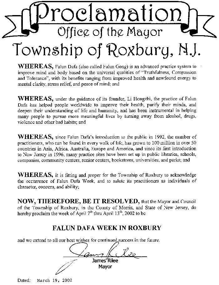 鉴于,法轮大法自1992年公开传出以来,亚洲、非洲、澳洲、欧洲和美洲的50多个国家中,有来自各阶层的一亿多人修炼法轮大法。自从1996年传入新泽西州以来,法轮大法在全州众多的图书馆、学校、公司、社区中心、老年中心、书店、大学、公园等处都设有固定的炼功点,并且,