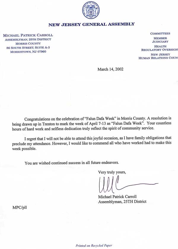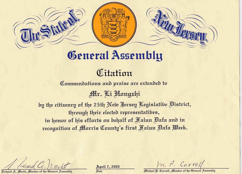 新泽西州第25选区的全体人民通过他们的民选代表,对李洪志大师为传授法轮大法所付出的努力致以敬意,同时认同首届摩利斯县“法轮大法周”。