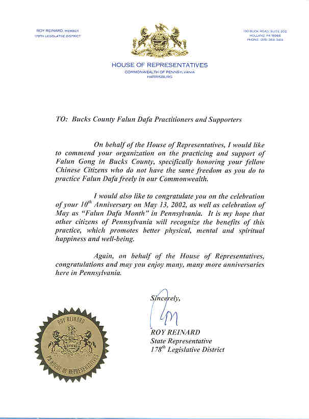在此,我代表众议会向你们表示祝贺!愿法轮大法在宾西法尼亚州常存!