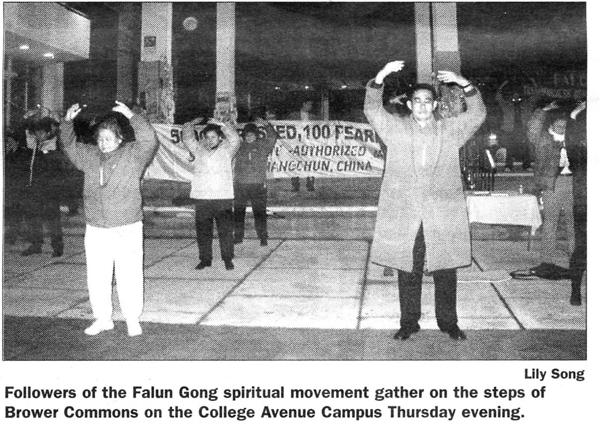 星期四在学院大道校园的布劳尔公共场地前面举行的集会中放映了一部录像片,向参加者们介绍法轮功功法并说明目前在中国发生的冲突。这个活动持续了三个小时,最后以半小时的炼功把本次活动推向高潮。