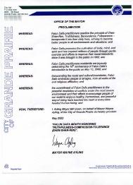 法轮大法修炼者们在最严酷的环境下和平解决冲突的决心以及他们鼓励世界人民选择健康、和谐与和平的生活的努力已打动了每一个心地善良的人的心;鉴此:我,常务市长比尔格文,代表格兰德伯爱瑞市市长韦恩艾林宣布2002年5月为“法轮大法真善忍月”。