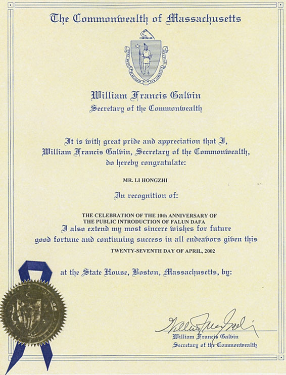 二零零二年四月二十七日马萨诸塞州,波士顿,于州政府签发者: 威廉.弗朗西斯.阁尔丰(William Francis Galvin)麻州州务卿