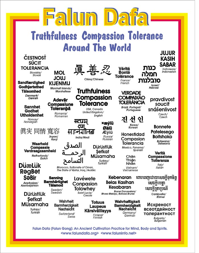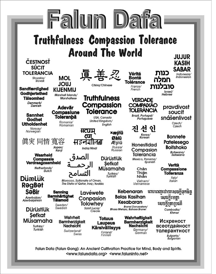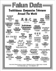 【明慧网2002年5月12日】华府明慧学校老师们把世界各国更多种语言的‘真善忍’收集在一起,做成彩色板及黑白板的单张(81/2" x 11")。近日我们特别加上“May 13th: World Falun Dafa Day”以庆贺即将到来的“世界法轮大法日”。
