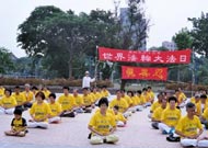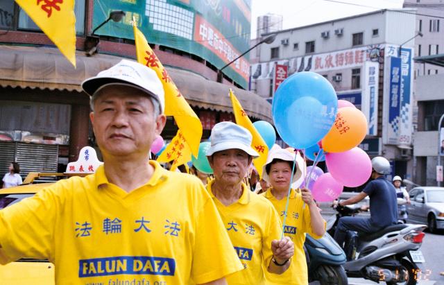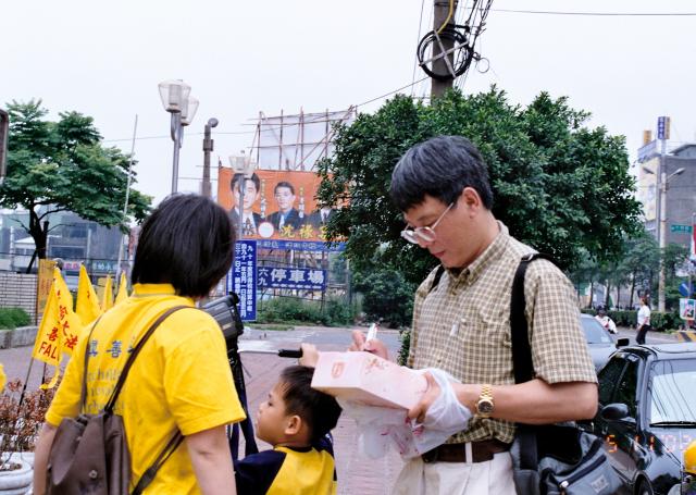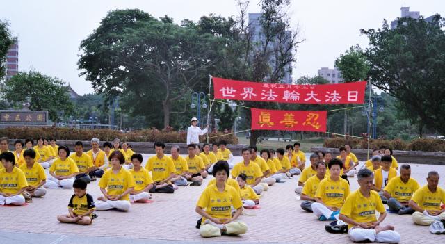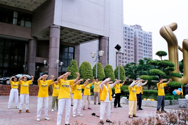 各队伍还选择在人口聚集的地方炼功,有在百货公司旁炼功的,也有在市公所前炼功的。市公所前我们还遇到了一位中华日报的记者,他说一早就看到我们在中正公园前集合,因此跟着我们的队伍来到这儿采访。问明了我们今天活动的内容及诉求后,很能理解法轮功讲真善忍而无端被迫害的情形及大法日的意义。