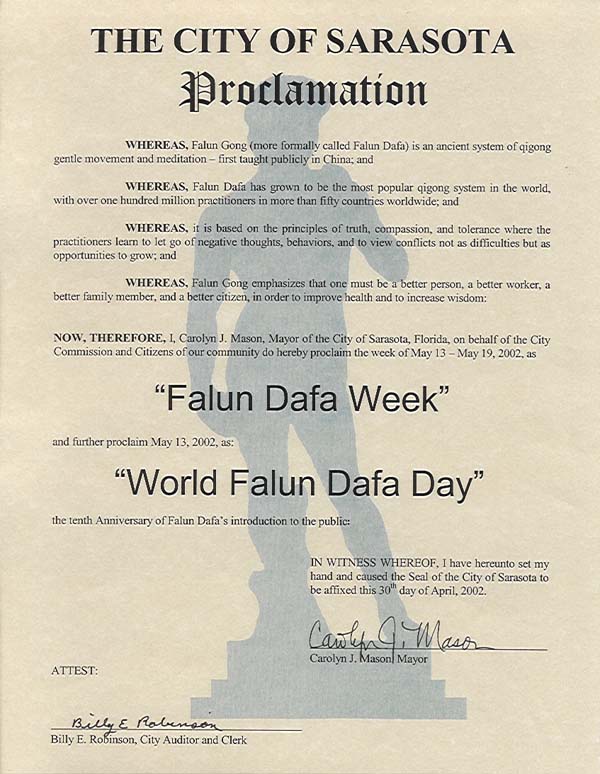 作为见证,我于2002年4月30日签字并加盖萨拉托加市((The City of Sarasota))公章于此。