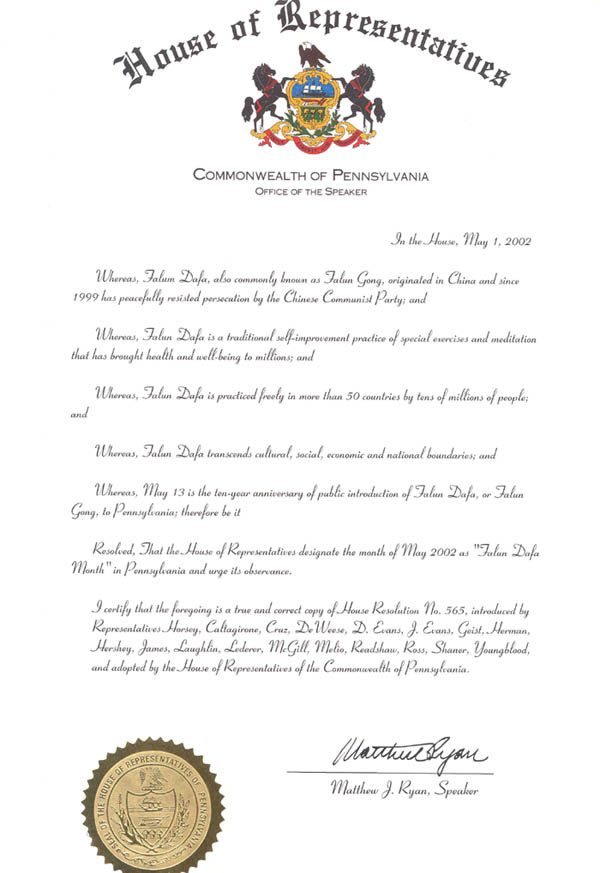 众议院经讨论后决定,2002年5月为宾夕法尼亚州“法轮大法月”,并促请参加其庆祝活动。