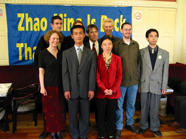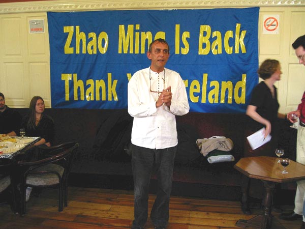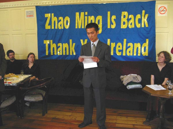 两位议员、国际特赦组织代表和三圣大学研究生会主席发表了热情洋溢、正义感人的讲话。爱尔兰政府众议院大卫.诺芮斯(David Norris)先生曾多次在议会就赵明的问题提案,提到法轮功是如此祥和,不应该受到这么残酷迫害。欧洲议员帕翠莎.莫肯女士(Patricia McKenna),“我们很高兴赵明获得自由了,但是我们不能忘了,在中国还有很多人(法轮功学员)在承受苦难,这场为了那些处于艰难处境下的人们的自由的运动还应该继续进行。赵明被抓前在爱尔兰读书,所以他在这里有许多支持帮助者;而中国还有千千万万处境艰难的人,外界无法知道并帮助他们。法轮功是一种祥和的修炼,他们只是通过修炼提高自己的道德水准,对社会没有任何危险、没有任何威胁,他们修炼的权利决不应该被剥夺,并因此遭受无名的苦难。我们必须为所有仍在中国遭受迫害的人们(法轮功学员)的自由和权利坚持不懈地努力。……”国际特赦组织爱尔兰分部运动主任富兰克.杰宁斯(Frank Jennings)提到,他认识赵明是在1999年赵明回国之前,那时中国已经开始镇压法轮功,赵明和另一位法轮功学员戴冬雪去跟他见面,寻求对法轮功的帮助。他几次应邀在为营救赵明的运动或新闻发布会上讲话,看到赵明终于安全归来很高兴,营救赵明是一个成功的运动。