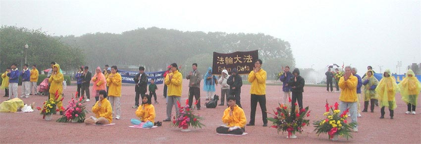 今天,大喷泉公园也正好是每年一次的芝加哥市万人步行活动的起点,这样上万名芝加哥市民都看到了弟子们祥和的炼功场,纷纷地行注目礼或不停地拍照。本来预报有大暴雨的清晨,在弟子们强大的正念下一直只是丝丝的飘着细雨,不知不觉的三四个小时过去了,小雨浸透了弟子们的头发、衣服,步行的人们纷纷对每一位在风雨中临危不动的弟子们表示了极大的佩服,真相的材料也随之发出去了,很多步行者结束活动又从弟子们的面前走过。