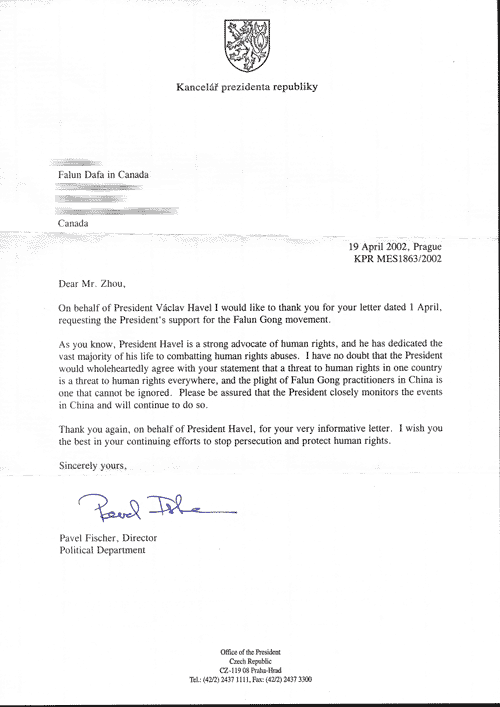 如你所知,哈维尔总统强烈提倡维护人权,并将他的大半生投身于反对人权虐待的斗争。我坚信总统会全身心地同意你的观点,即一个国家对人权的威胁就是对任何一个地方的人权的威胁。中国法轮功学员的困境是绝不能忽视的。请放心,总统将一如既往地密切关注在中国的事态发展。