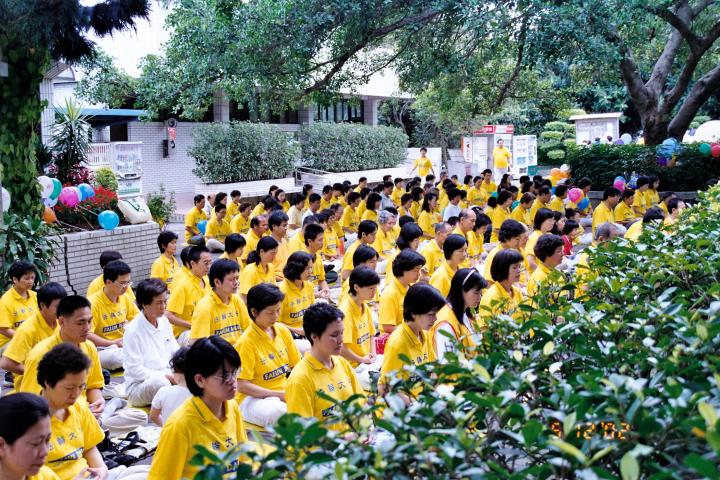 【明慧网2002年5月14日】2002年5月13日第三届世界法轮大法日,台湾桃园、内坜、中坜地区一百三十余位学员会聚于桃园虎头山上举行洪法庆祝活动。天气风和日丽,山上游人如织,一路走来人们手中、休憩区石桌、树上到处飘汤着『法轮大法好,真善忍』,字字句句烙印在人们的心中,随风跳跃的五彩气球,有如天地万物同欢“大法十年洪传”。大法弟子正念清除