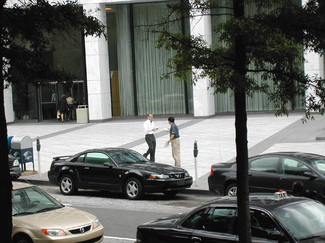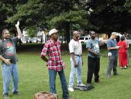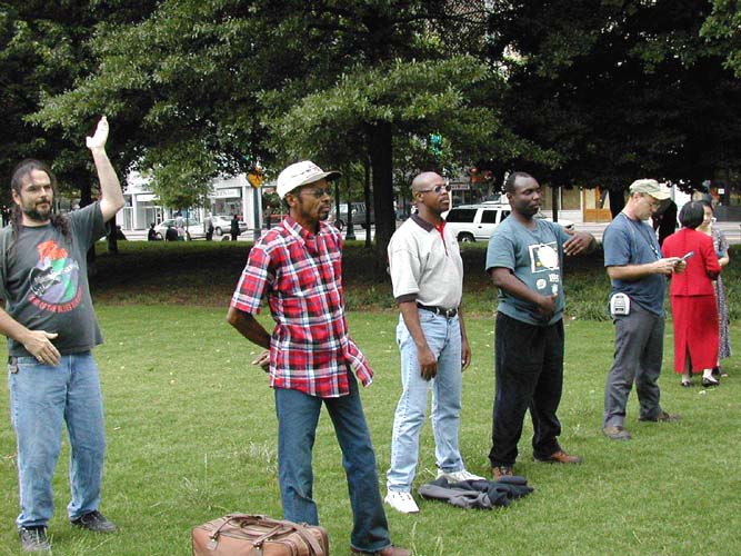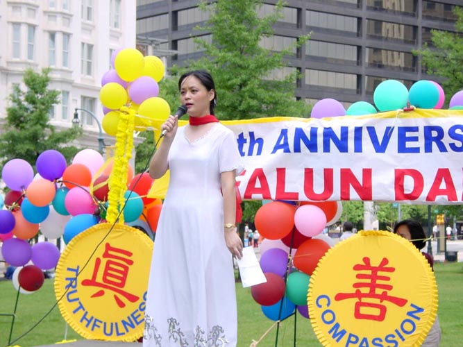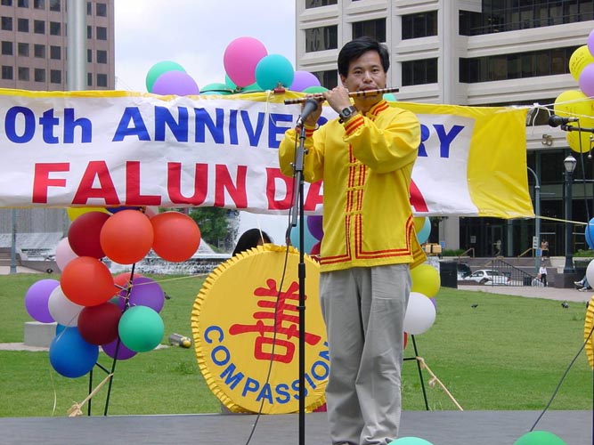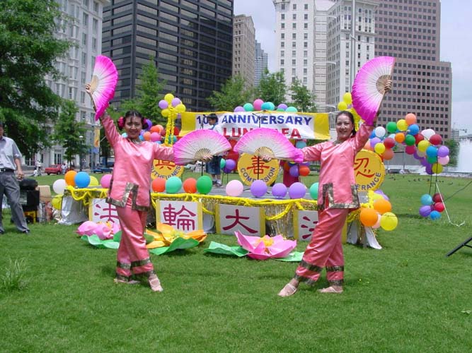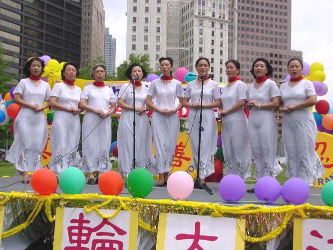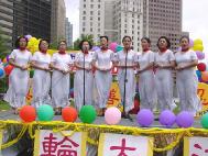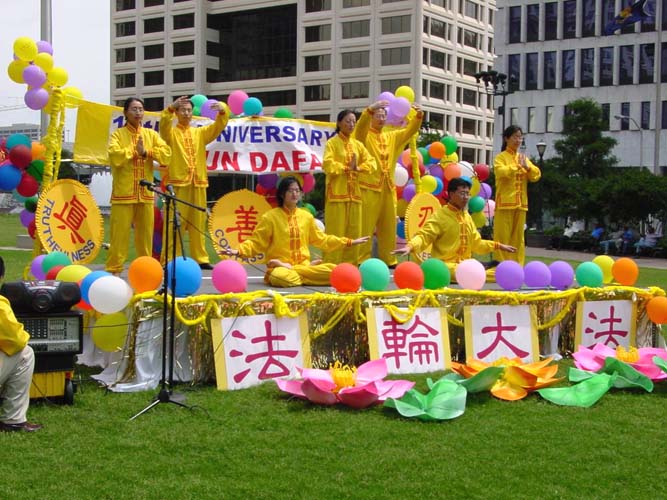 庆祝活动之初,层层叠叠的乌云夹着狂风滚滚而来。学员们不为所动,发正念,铲除另外空间破坏大法的一切邪恶。而后,乌云渐渐散去,凉风习习。有缘人络绎不绝地来到这里,索取资料,跟着台上的学员炼起了优美的功法;听学员用民乐笛子吹奏的《九双鞋》,行人为之驻足,在场的人都真切地感受到了那一种浩然正气,直冲云霄;九位身穿白色长裙的女学员唱起了《登归途》,《得度》,《法轮大法好》,那用心谱写和演唱的歌曲,向芸芸众生传达着大法无限的慈悲和无以伦比的美好;两位女大法弟子在“悠悠万古魂”的乐声中,舞起了彩扇,彩绸,犹如飞天凌空,天女下凡,在她们脸上闪烁着动人的纯真和喜悦,是啊,这对大法弟子来讲,是殊胜普天同庆的日子,方寸舞台,表达了众弟子对师尊十年慈悲苦度的感激和助师正法的决心。