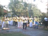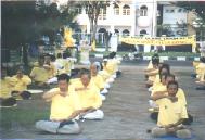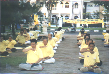 5月12日,13日两天,同修们穿上了醒目的黄T恤,纷纷走上街头,在公园,在闹市,在河畔,在人群密集的地方,向人们派发大法资料;告诉人们法轮大法好;发正念清除邪恶;示范五套功法,把大法的美好展示给印尼人民。有的人在现场就要求学功,有的人还主动帮大法弟子派发资料。