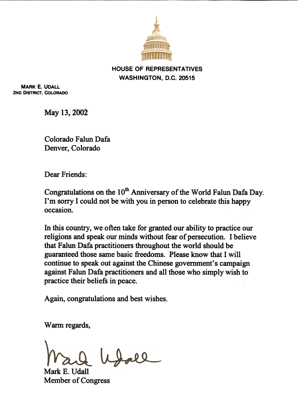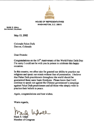 在这个国家里,我们经常视我们宗教信仰的权利为最自然不过的事,我们可以畅所欲言而无须害怕受到迫害。我认为全世界的法轮大法学员应被赋予同样的这些基本权利,请相信我将继续大声疾呼,反对中国[江泽民]政府镇压法轮大法学员和其他任何仅希望能安心信奉他们信仰的人们。