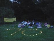 黄昏时分,大家用烛光组成一个大型的数字“10”,在箫的伴奏下齐唱大法弟子创作的歌曲。整个活动充满了祥和的气氛。这天公园的人比往常都多,人们对了解大法表示出极大的兴趣,很多人停下提问题。