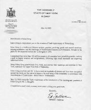 纽约州议员致信祝贺法轮大法弘传十周年