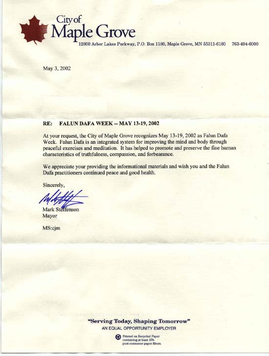 应你们的要求,枫叶林市确定2002年5月13日至19日为法轮大法周。法轮大法是一套完整的修炼体系,通过平和的动功和打坐达到改善精神和身体健康的目的。法轮大法有利于促进和保持人类“真、善、忍”的美好特性。