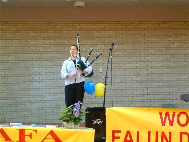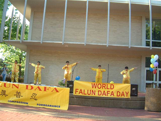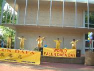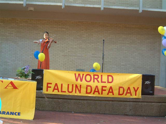 下午6时许,演出在五位身穿金黄色炼功服的学员优美的功法展示中拉开了序幕。接着一位美国学员简单介绍了法轮大法和法轮大法日的由来。然后学员们登台献艺,有小提琴演奏“普度”,吉它伴奏的歌曲“得度”、“云里追”,和用风笛(BAGPIPE,爱尔兰乐器)演奏的纪念被迫害致死的大法弟子的乐曲。演出中穿插了对节目和演员的介绍,这里面有修炼后绝症不翼而飞的神奇,西人学员走上天安门歌唱“得度”使警察落泪的动人,王丽萱母子被迫害致死的哀惋,也有赵明历尽艰辛不屈归来的振奋。风笛的演奏特别打动了一位观众的心,她与大法弟子交谈后答应写信给政府官员表达对法轮功受迫害情况的关注。许多人都关切地询问着中国国内的情况,对法轮功学员的勇气表示钦佩,并说这么好的功法被禁止实在太不可思议了。另一些人马上就想学功,一个越南女孩说,她想学法轮功已经想了好久,现在终于联系上了。