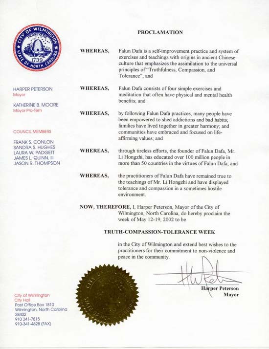 在此,我,北卡罗来纳州威明顿市(Wilmington)市长哈珀. 帕特森,宣布2002年5月12日至19日为威明顿市的